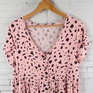 PINK & BLACK ANIMAL PRINT SHORT SLEEVE V NECK BUTTON DOWN LOOSE FIT RAYON MIDI DRESS WITH POCKETS SIZE SMALL BY LULAROE PRE OWNED LIKE NEW CONDITION