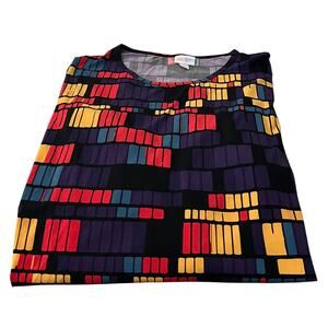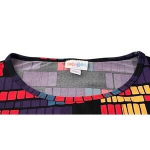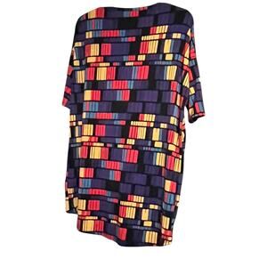 LULAROE SHORT SLV HI-LOW PULL-OVER RND NECK BLOUSE, WOMENS, M-YELL BLUE ORG PURP