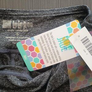 This is a LuLaRoe Simply Comfortable Jade charcoal gray and multicolor athletic capri in a size small. That tag says that it is 47% nylon, 45% polyester, and 8% spandex and also 90% polyester and 10% spandex so the multicolor sides must have a different fabric content than the capris. They are new with the tags.