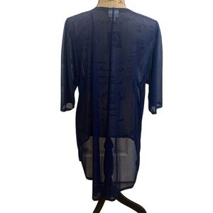 LULAROE Sheer Navy Lindsay Kimono Cover NWOT Size S. Loose 3/4 sleeves and a high low hemline. Runs large so can be worn for a large variety of sizes. Very forgiving cut. Lightweight and flattering.