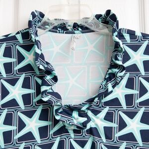 LULU B Size M Blue Starfish Print Ruffle Collar Long 3/4 Sleeve UPF 50 Active Performance material. Very Stretchy and comfortable! Bold and Vibrant colors! Excellent condition!