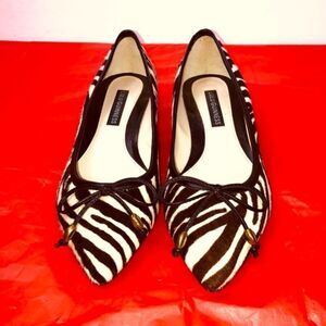 NWOT. LULU GUINNESS brown and white pony hair zebra stripe kitten heel pumps trimmed with brown leather. Front of the shoes have a tie string bow. 1/2” heel, pointy toes. Size 5.5