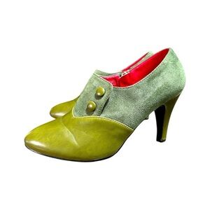 LULU HUN, LONDON, WOMENS GREEN SUEDE & LEATHER HEELS WITH RED INSOLE. 2-BUTTON DETAIL ADDS CHARM & SOPHISTICATION TO THESE EYE-CATCHING, 3” HEELS. SIZE 5 ON BOTTOM OF SHOE, WOULD EQUAL SIZE 7 US.