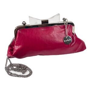 LULU Red CLUTCH HANDBAG 10x5 Faux Leather Evening Bag Acrylic Bow Purse Chain