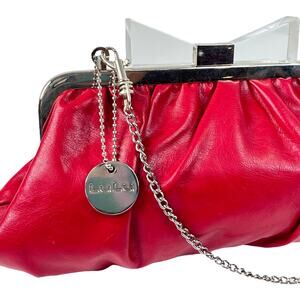 Vintage LULU Red CLUTCH HANDBAG 10x5 Faux Leather Evening Bag Acrylic Bow Purse With Silver 25" Hidden Chain - Excellent Condition!
