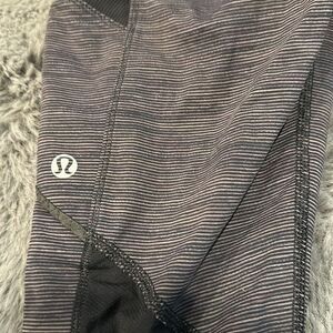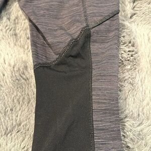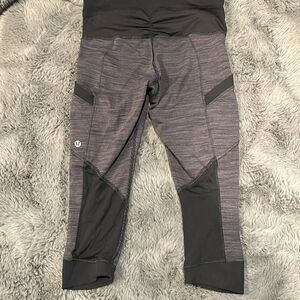 Very nice pair of Lululemon 3/4 length leggings, black, gray, pink and tans, banded wast line, mesh detailing on back, reflective, detail on sides, pockets inside and on side of leggings, scrunched side of leggings waist 26 inches stretches to 30 inches size 6/8, 24 inches length with stretch