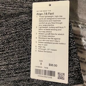 BRAND NEW W/ TAG* This LuLuLemon Align 7/8 Pant In Twillines Ice Black Pattern Is Lightweight With A Buttery-Soft Nulu Fabric Making It Sweat-Wicking With A Four-Way Stretch. All Of My LuLuLemon Lovers ❤️ Know That The Aligns Are SO Comfortable!