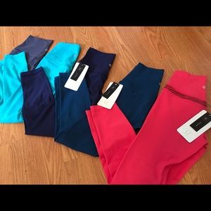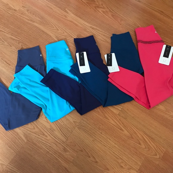 From left to right-SOLD align pant ll Greyvy 4 EUC. SOLD Original Align pant peacock blue 2 EUC worn 1 time. SOLD Align pant ll Hero blue 4 NWT. SOLD Align pant ll poiseidon 4 NWT. Original align pant Boom Juice 4 NEW with tags detached. Some will be at a higher price than others. Let me know which one your interested in and we can discuss prices.