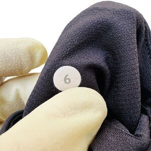 Lululemon Athletica black leggings. Lululemon logo at back left leg and on zipper pulls of pockets.