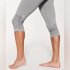 Stylish gray capri leggings with ruched sides. Perfect for workouts or casual wear.