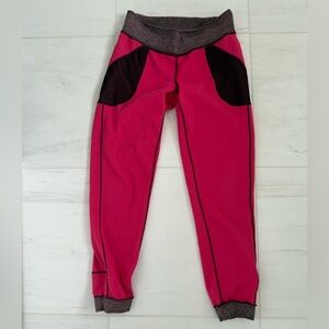 Warm, reversible Rulu fabric is soft and moisture-wicking with four-way stretch. Inside is lined with hot pink lightweight fleece for added warmth. Dual waistband elastic cuffing (see pics 4 & 8) for that lil something extra at the waist. Hot pink drawstring cord with metal signature tips (see pic 12).