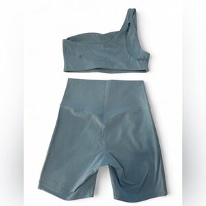 Lululemon light blue one shoulder bra and shorts set