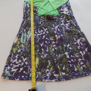 Lululemon dancing warrior tank in a purple & green floral pattern. Green strappy back. Built-in