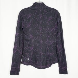Signature foldover cuffins in the sleeves help keep our hands warm and breathable Mesh under the arms lets us blow off post-practice steam. Slim fit for easy layering over a tank or under a jacket. Luon fabric. Color: Beautiful Baroque Deep Zinfandel, rose gold zipper details.