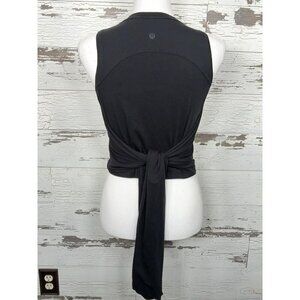 Tie in front or back; looks great at the gym or out on the town! Very versatile, lightweight top by Lululemon. Vintage black (not bright, and not faded) with approx 4.5" wide, 25" long sash that can be tied at the front or wrapped and tied at rear. Worn once. In nearly new condition. NOTE: There is NO size bubble, but my sister normally wears lulu size 6. PLEASE make note of all measurements to ensure proper fit. Approx 16" armpit to armpit, 17" mid-shoulder to hem. Cotton Blend. Very soft hand feel. Machine wash.