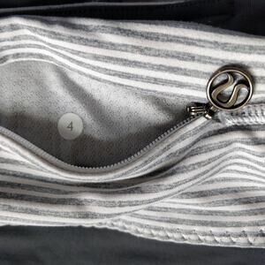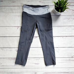 This is a pair of cute Lululemon cropped leggings in size 4. Grey with a white-and-grey waistband. Side pockets and a zip back pocket. Drawstring. In great, gently used condition.