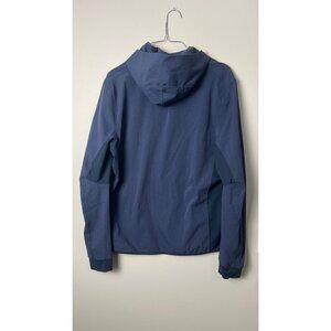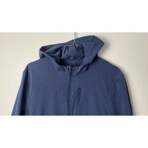 LULULEMON HOODED JACKET IN A SIZE M. THE JACKET FEATURES A LIGHTWEIGHT TECH FABRIC WITH VENTILATION ACCENTS THROUGHOUT. ZIP FRONT WITH ZIPPERS AT THE POCKETS. EXCELLENT CONDITION.