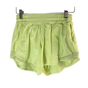LULULEMON Hotty Hot Low Rise Short 4" Color: Crispin Green Size 4 Condition: Pre-Owned in great used condition. - Designed for Run - Built-in liner - Discreet side zippered pocket - Tiny liner pocket - Continuous drawcord - Reflective detail helps keep you on the radar in low light Measurements approx: flat across Waist: 11.5” (without stretching) Inseam: 10” If you require clarification on any point, or if you believe any information presented is inaccurate or misleading, please contact me