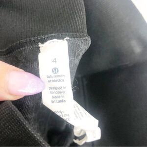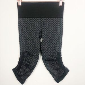 Cute and comfy cropped leggings by Lululemon athletica. Black waistband with grey and black Geo Soul Honeycomb print. Seamless. Metal Lulu logo on the back of the leg. Ruching on the legs to get it to the just below the knee length. Great condition. Womens size 4.