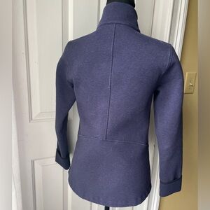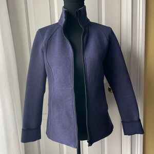 Very good used condition Lululemon Insculpt jacket. Size 4. Heathered indigo blue color with black piping and zippper detail. Sleeves can be worn cuffed as pictured or unrolled.
