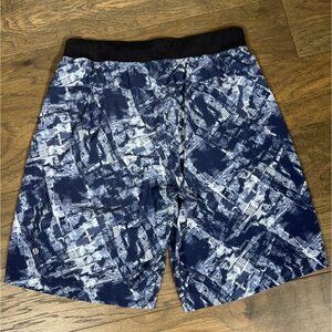 Athletic shorts that transfer seamlessly from the gym to the beach! In navy/white gradient print, they have interior drawcord, slip in hip pockets with mesh coin/key pocket on right side; faux fly; quick dry material. Nylon blend. Machine wash. In nearly new condition. NOTE: No size tag or bubble. Please see measurements to ensure proper fit.