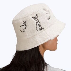 New with Tags. LULULEMON New Year Bucket Hat – A limited edition, rare find, and completely sold out! This reversible bucket hat features a cozy fleece side with embroidered rabbits and a sleek, sweat-wicking Swift fabric side in a versatile cream shade. The viral must-have hat for comfort and style!