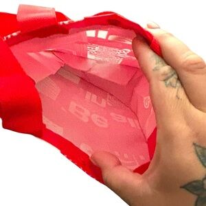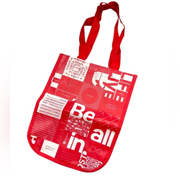 LULULEMON REUSABLE RED & WHITE LOVE MINI TOTE BAG WITH RED HANDLES SNAP CLOSURE