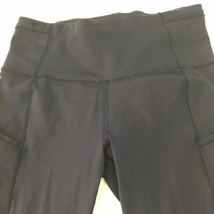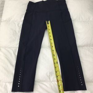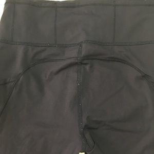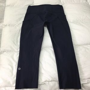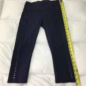 Lululemon running crop. It has side pockets perfect for the iPhone. On the stitching there is some noticeable white dots from the wear (they came after the first washed) Worn several times - Prices accordingly. Reasonable offers are always acceptable.