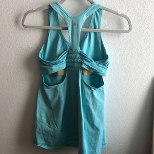 Brilliant turquoise colored racer back tank top. Has a built in sports bra to provide support!