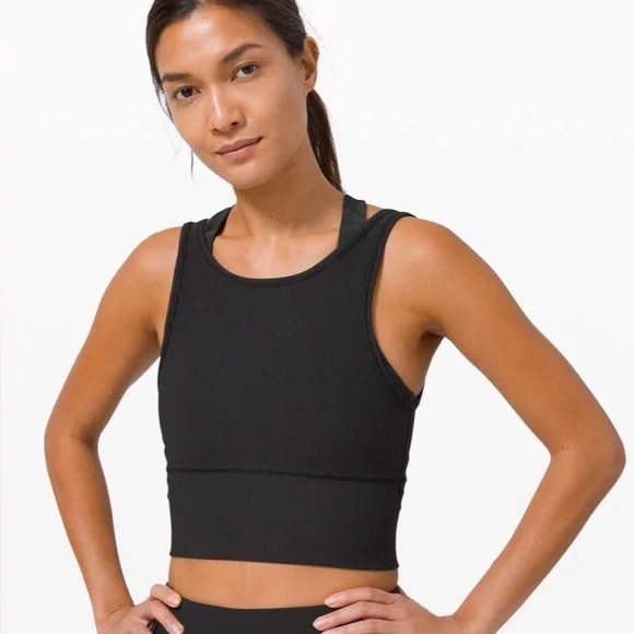 Ribbed Power Pivot Tank from Lululemon. Can be worn two ways- reversible front and back. Color is black.
