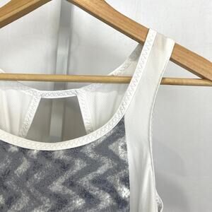 Scoop neck, narrow straps, cutout and split back for venting, pullover style, body-skimming fit, hip length. Moisture wicking, breathable, anti-stink, chafe resistant Luxtreme fabric. Gray zig zag / white.