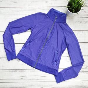 This is a pretty and comfy Lululemon "Sweaty Or Not" jacket in size 4. Bright purple; mesh fabric keeps you cool.