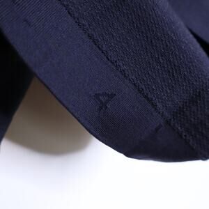Slim fit, stretchy, racerback tank top in dark navy blue. Mesh construction, scoop neckline, and a reflective logo on the back.