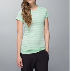 Super cute Lululemon Swiftly Tech Short Sleeve *Stripe Top, Sz 4... in very good condition...4 along the lower inside bottom. Color is Heathered Fresh Teal Green.