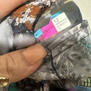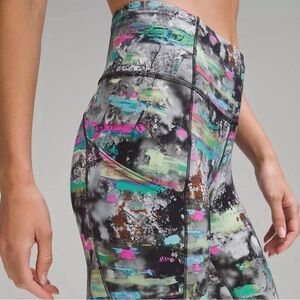 Vibrant leggings with an abstract print. Features splashes of pink, green, and black.