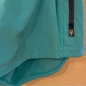 Pre-owned in great condition with no rips but has a tiny white dot on the front left hem and inside tag shows some cracking as shown in pictures. Has normal wear. Women’s turquoise athletic shorts. Comes from smoke and pet free home.