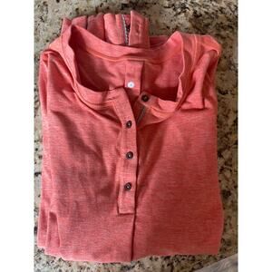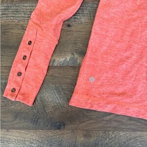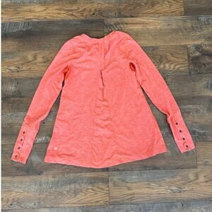 LULULEMON Women’s Long Sleeve, Flare Bottom Top in Orange Heather (S/4). Super unique top with buttons in front and on sleeves which have thumb holes. Silver reflective trim at the base of the sleeves. Like new, unworn condition. Lulu size 4 so a women’s XS/S. This top has a good amount of stretch. Lovely, super soft fabric.