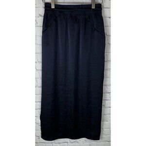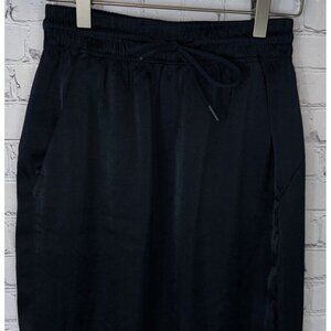 This is a beautiful silky midi skirt by Lululemon. This is navy blue, this is a size 2/4? and it is in great condition. There is no size tag so here are the measurements: the waist laying flat measures 12 1/4 inches; the length from the top of the waist band to the bottom hem measures 33 inches. There is no logo on the skirt. The only logo is on the strings. So pretty.