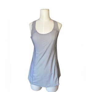 This lululemon athletica tank top features a sleek, fitted design in a versatile gray color, perfect for layering or wearing on its own. The tank top's sleeveless style and comfortable armholes allow for easy movement, while its hip-length cut offers a flattering fit. Crafted from a soft, lightweight fabric, it provides both comfort and style for any casual occasion.