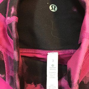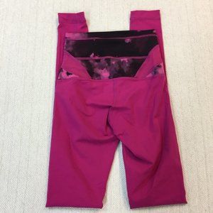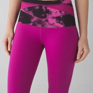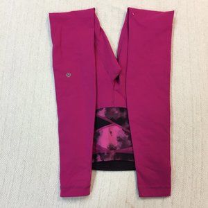 LULULEMON Wunder Under High Rise Reversible; Raspberry/ Blooming Pixie- Full On Luon. Pink/purple full length leggings with patterned criss cross waistband. High rise. Has logo on inside waistband. Excellent condition! Size 2