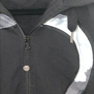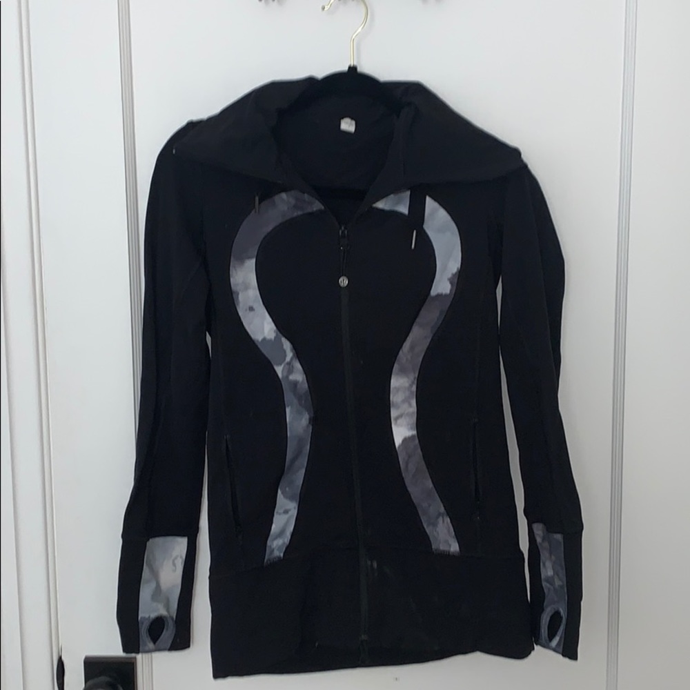 I’m not sure what style it is. Black jacket with gray tie due lulu shape. Hood