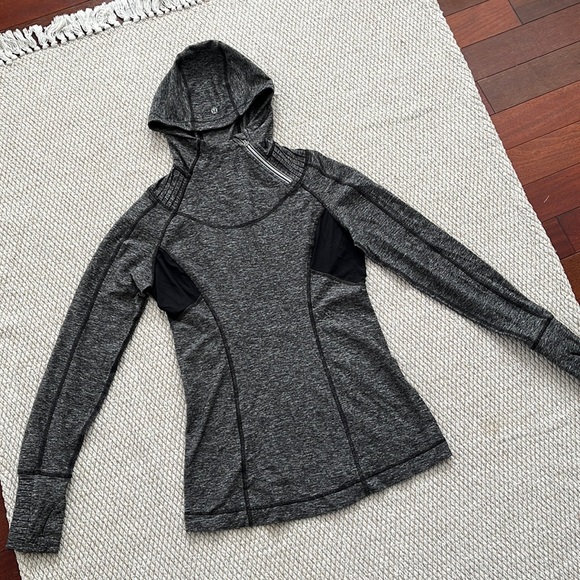 Brand new without tag. I had this top for many years in closet and never worn. This is an older piece from LULULEMON. Super nice with reflective strips on thick cuffs and thumb holes. The back has lower right zipper pocket perfect for key and maybe cellphone. Hood has a thoughtful ponytail opening.