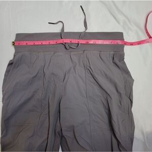Titanium grey dance studio crop pant by Lululemon. Adjustable drawstring at the ankles. Swift fabric. No tags attached. Tint spot shown in photo. The bar at the back of the waistband indicates size 4. Please refer to measurements.