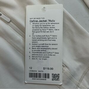 LULULEMON Off White Define Zip Front Jacket Nulu Size 12 NWT