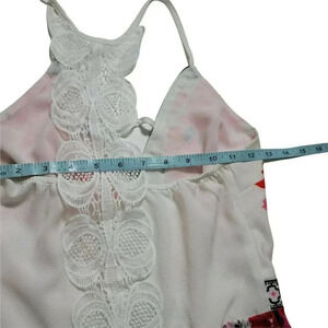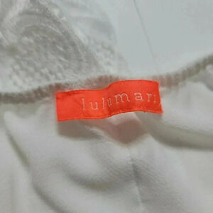 LULUMARI WHITE MINI DRESS V NECK FLORAL PRINT ON THE SIDES A-LINE women's. This beautiful dress is perfect for any occasion. It is pre-owned without a sign of wear, which is very good condition . The dress is lined, and the back hack is a very cute embroidered column.