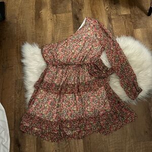 LULU’S Anew Romance Pink Floral Print One Shoulder Ruffled Mini Dress
