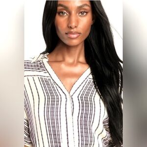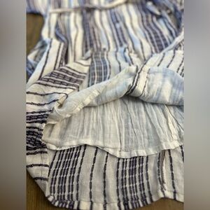 * Gauzy woven fabric, with a striped pattern throughout, shapes short cuffed dolman sleeves that frame a shirt-style dress with a collared neckline
