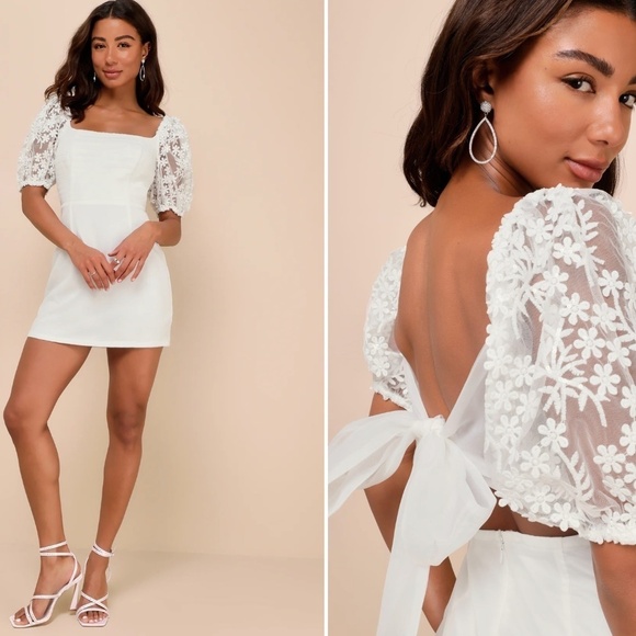 You'll cast an adorable spell when you wear the Lulus Charming Potential White Organza Backless Puff Sleeve Mini Dress! Lightweight mesh fabric shapes short puff sleeves (with elastic at the cuffs and shoulders) that feature an embroidered floral design with sparkly sequin accents. Airy woven organza forms the dress, shaping a bodice with a square neckline, fitted waist, and chic pleated detailing. At the back, a wide sash forms an oversized bow across the open back. Skirt has a figure-skimming fit and falls to an A-line mini hem. Hidden zipper/clasp at back.
