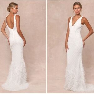 $388 Retail LULUS Bridal Wedding Elegant Sophisticated STUNNING Beaded Sequin Feathers Gown with Train NWT
