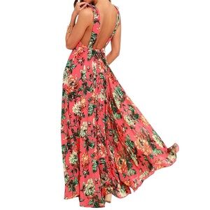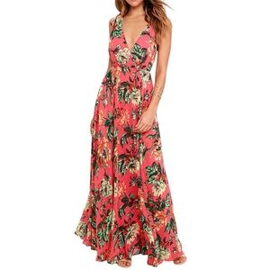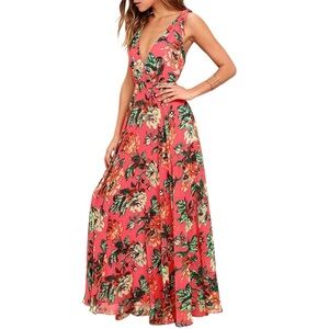 LULUS Countryside Manor Coral Red Floral Print Maxi Dress Size M